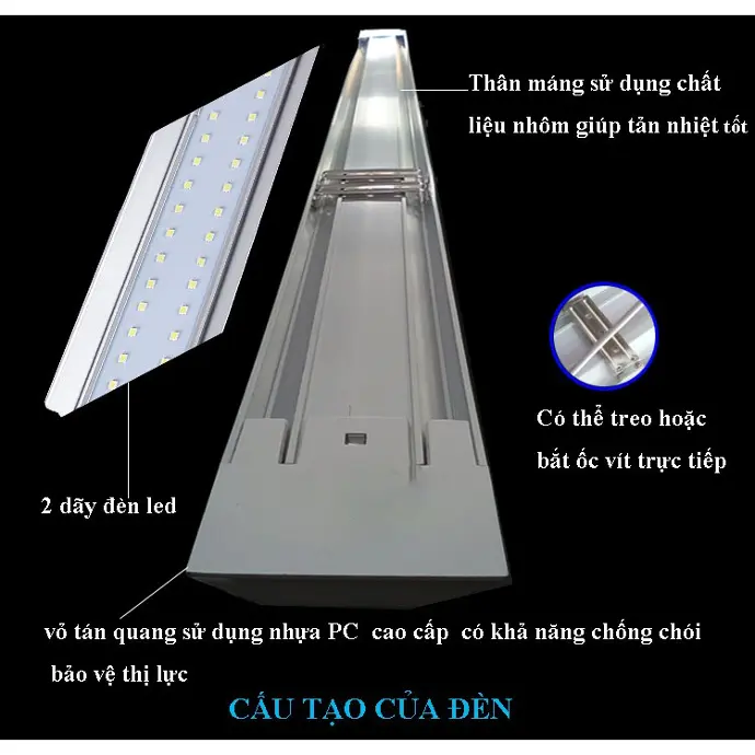 - Máng đèn: Làm từ hợp kim nhôm, sơn tĩnh điện giúp cố định các bộ phần của đèn, ngoài ra máng được làm từ nhôm còn giúp quá trình tản nhiệt của chip LED tốt hơn từ đó tăng tuổi thọ cho chip LED